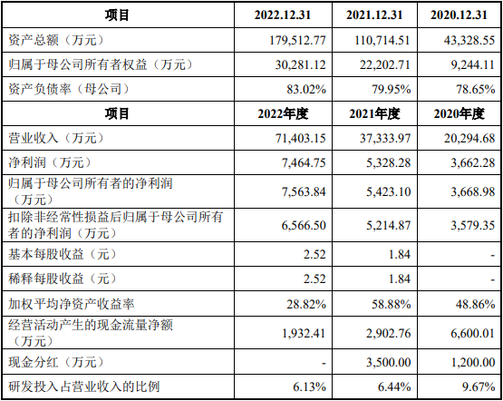 2020年至2022年,誉辰智能实现营业收入分别为20,294.68万元、37,333.97万元和71,403.15万元,实现归属于母公司所有者的净利润分别为3,668.98万元、5,423.10万元和7,563.84万元,实现扣除非经常性损益后归属于母公司所有者的净利润分别为3,579.35万元、5,214.87万元和6,566.50万元。