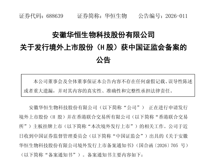 华恒生物(688639.SH)于周五(4月3日)发布公告,公司于近日收到中国证监会国际合作司发布关于安徽华恒生物科技股份有限公司境外发行上市备案通知书(国合函[2026] 705号)。