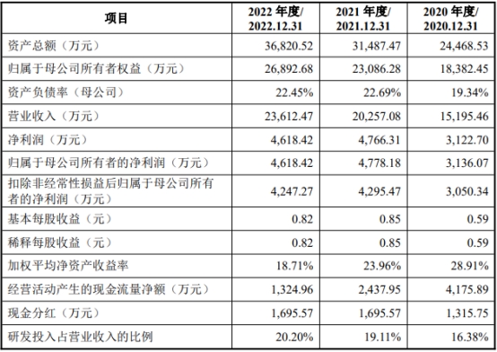 2020年至2022年,盛邦安全营业收入分别为15,195.46万元、20,257.08万元、23,612.47万元;净利润分别为3,122.70万元、4,766.31万元、4,618.42万元;归属于母公司所有者的净利润分别为3,136.07万元、4,778.18万元、4,618.42万元;扣除非经常性损益后归属于母公司所有者的净利润分别为3,050.34万元、4,295.47万元、4,247.27万元。