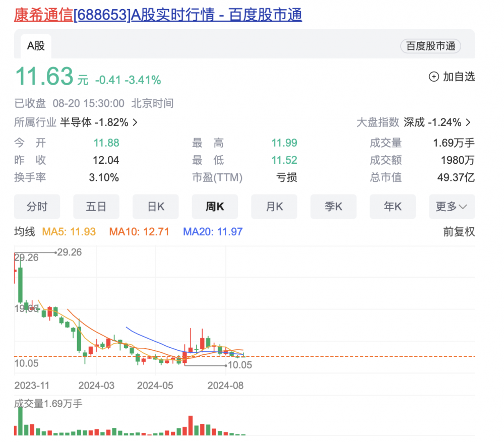 资料显示,康希通信于2023年11月17日登陆科创板,发行价为10.5元,发行6368万股,募资总额为6.69亿元。开盘价为26元,股价最高29.26元。不过,此后该公司股价一路走低,截止今日发稿,康希通信股价为11.63元,总市值49.37亿元。