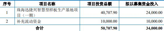 本次向不特定对象发行可转换公司债券募集资金总额不超过34,000.00万元(含本数),扣除发行费用后,募集资金拟用于珠海迅捷兴智慧型样板生产基地项目(一期)、补充流动资金。