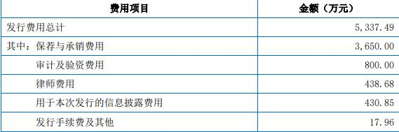 公司公开发行新股的发行费用总额为5,337.49万元,其中保荐机构获得保荐与承销费用3,650.00万元。