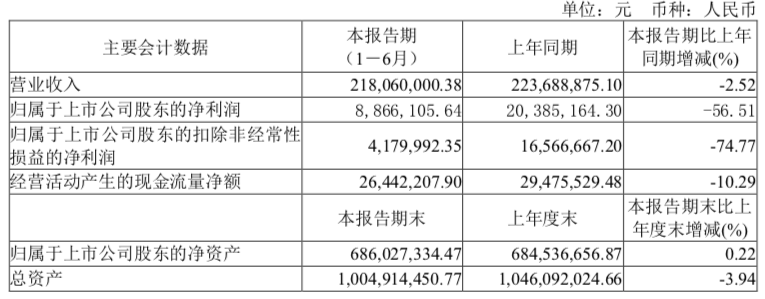 8月30日,迅捷兴发布2023年半年度业绩报告称,上半年公司实现营业收入为21,806万元,同比下降2.52%;归属于母公司股东的净利润为886.61万元,同比下降56.51%;扣非后净利润为418万元,同比下降74.77%;基本每股收益为0.07元,同比下降53.33%。