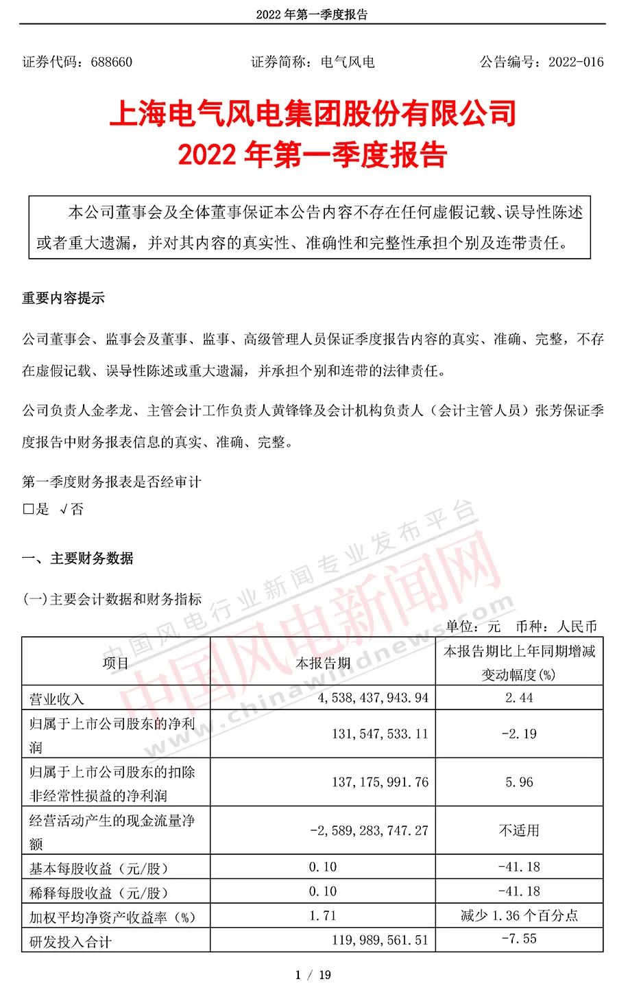 4月25日,电气风电公布2022年第一季度报告,报告期实现营业收入45.38亿元,同比增长2.44%;归属于上市公司股东的净利润1.32亿元,同比下降2.19%;归属于上市公司股东的扣除非经常性损益的净利润1.37亿元,同比增长5.96%。