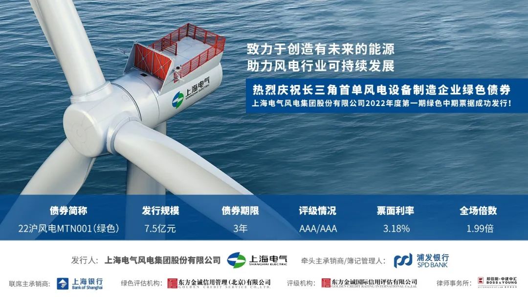 上海电气风电集团股份有限公司(以下简称“电气风电”)在银行间市场成功发行2022年度第一期绿色中期票据,金额7.5亿元,期限3年,利率为固定利率3.18%,募集资金用于归还金融机构贷款。电气风电此次债市首秀,标志着长三角首单风电设备制造企业绿色债券成功落地。
