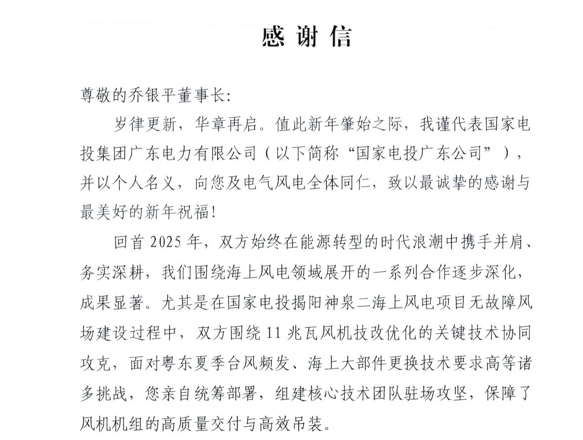 近日,电气风电收到国家电投集团广东电力有限公司发来的感谢信,对电气风电在2025年双方海上风电合作中展现出的卓越技术实力、高效项目执行与可靠运营保障予以高度认可。