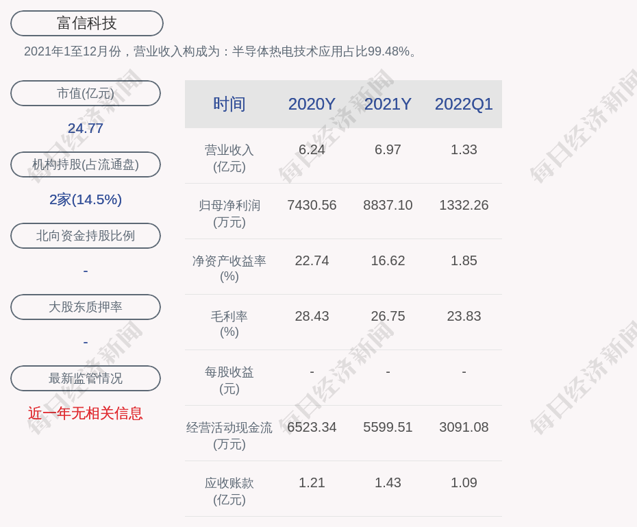 2021年1至12月份,富信科技的营业收入构成为:半导体热电技术应用占比99.48%。