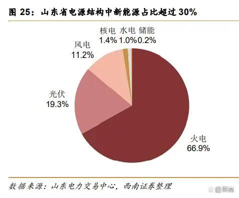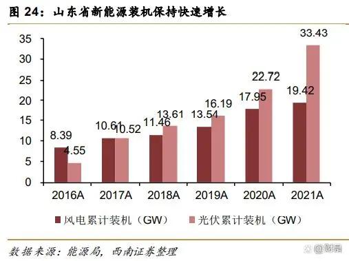 山东省新能源发展迅猛,风电、光伏装机占比超 30%。近年来,山东省新能源装机保持快速增长势头。截至 2021 年末,光伏累计装机 33.43GW,位列全国第一;风电累计装机 19.42GW,位列全国第六。山东省电源结构中,风电、光伏装机容量占比达 30.5%。根据《山东省电力发展“十四五”规划》,到 2025 年,光伏发电装机达到 65GW,风电装机达到 28GW。