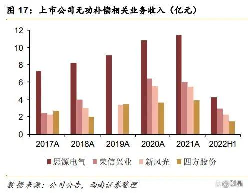 SVG 行业竞争格局相对分散,新风光在新能源领域优势明显。上市公司中,思源电气、荣信兴业、新风光无功补偿相关业务收入规模领先。2021 年,思源电气无功补偿类及相关产品(包括 SVG、SVC、有源滤波装置、电力电容器、整流器、充电桩等产品)收入 11.42 亿元,荣信兴业 SVC、SVG、串补、电力滤波装置、有源滤波装置收入 6.00 亿元。思源电气无功补偿产品在输配电领域优势明显。荣信兴业的 SVC 国内市场份额大,并开发出 SVG 等产品,相关产品广泛应用于电力、煤炭、有色金属、冶金、新能源发电、船舶等领域,并出口至欧洲、美洲、亚洲多个国家和地区。新风光在新能源领域市占率较高,近年来收入占比在 80%以上。