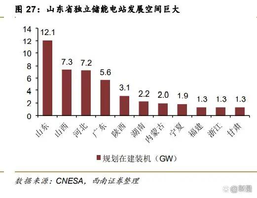 山东独立储能商业模式完善,市场发展潜力巨大。高比例可再生能源接入,也给电网消纳提出更高要求,促进了储能产业发展。根据《山东省能源发展“十四五”规划》,计划到 2025 年建设 4.5GW 左右的储能设施,鼓励新建集中式风电、光伏项目按照一定比例配建或租赁储能设施。2022 年 8 月山东省能源局印发《关于促进我省新型储能示范项目健康发展的若干措施》,明确独立储能现货市场套利、容量补偿、辅助服务、容量租赁的商业模式。