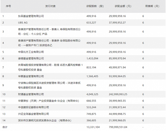 鼎通科技12月14日公告,根据投资者申购报价情况,并严格按照《认购邀请书》中确定的程序和规则,确定本次发行价格60.01元/股,发行股数1333.11万股,募集资金总额8亿元。本次发行对象最终确定为14家,诺德基金、财通基金,华夏基金等在列。