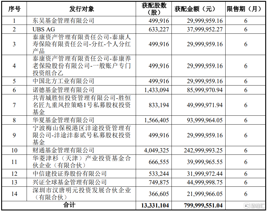 鼎通科技(688668.SH)公布2022年度向特定对象发行A股股票发行情况报告书,此次发行价格60.01元/股,发行股数1333.1104万股,募集资金总额约8.0亿元。此次发行对象最终确定为14家,发行配售结果如下: