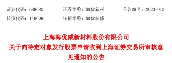 中国经济网北京2月9日讯上海海优威新材料股份有限公司(简称“海优新材”,688680.SH)昨晚发布关于向特定对象发行股票申请收到上海证券交易所审核意见通知的公告。海优新材于2023年2月8日收到上海证券交易所出具的《关于上海海优威新材料股份有限公司向特定对象发行股票审核意见的通知》,具体意见如下:“上海海优威新材料股份有限公司向特定对象发行股票申请符合发行条件、上市条件和信息披露要求,本所将在收到你公司申请文件(注册稿)后提交中国证监会注册。”