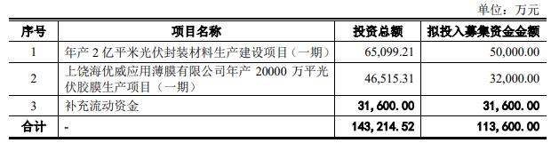 2月4日,海优新材发布的2022年度向特定对象发行A股股票预案(修订稿)。本次向特定对象发行股票募集资金总额不超过113600.00万元(含本数),扣除相关发行费用后的募集资金净额拟用于年产2亿平米光伏封装材料生产建设项目(一期)、上饶海优威应用薄膜有限公司年产20000万平光伏胶膜生产项目(一期)、补充流动资金。