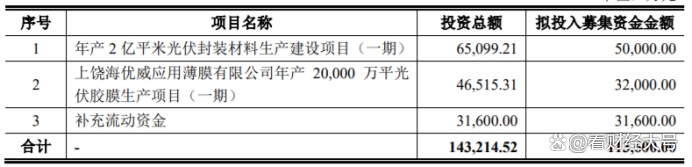 为了让融资看起来更加合情合理,海优新材做足了功夫。比如说,5个亿“用于年产2亿平米光伏封装材料生产基地项目”;比如说,3.2个亿用于“年产2亿平光伏胶膜生产项目”。