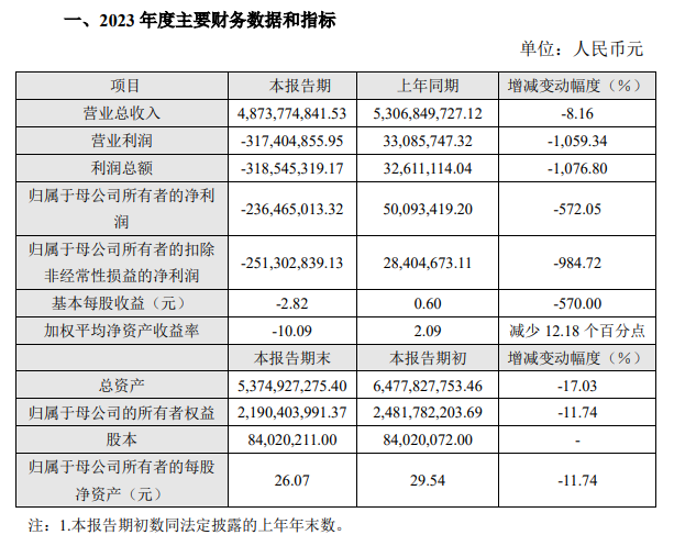 其中,营业总收入48.74亿元,同比下降8.16%,归母净利润亏损2.36亿元,同比下降572.05%,同比由盈转亏。扣非后净利润亏损2.51亿元,上年同期为盈利0.28亿元,同比下降984.72%,由盈转亏。