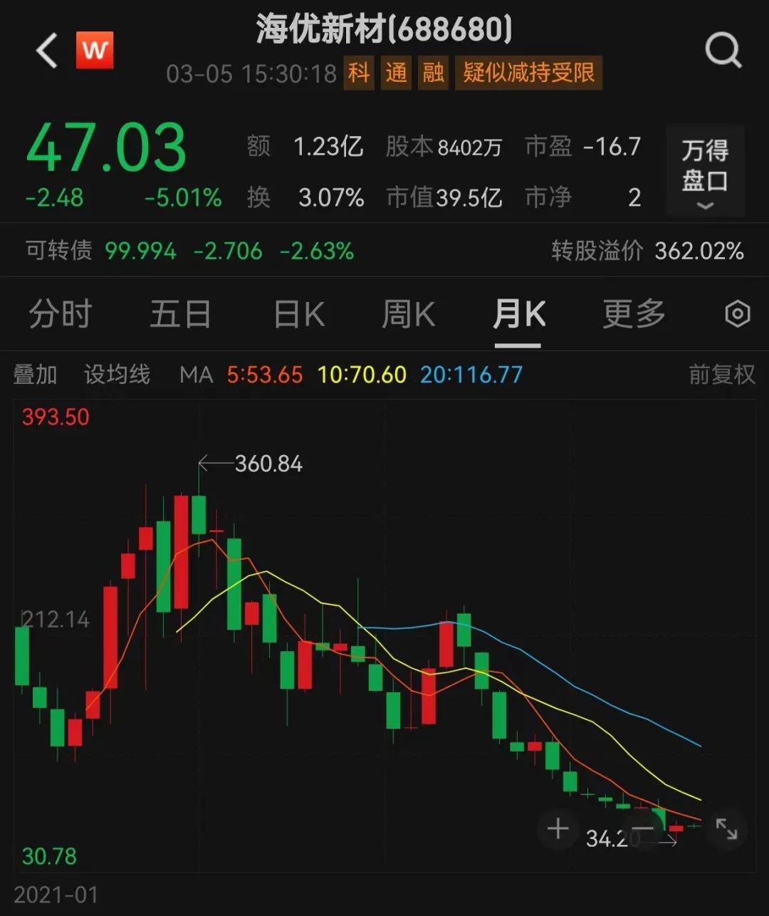 上市刚满三年的海优新材,股价自最高361.48元,一路下跌至47.03元,跌幅近87%。并且从去年11月下旬起,股价持续破发至今。
