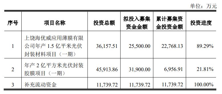 对于本次募投项目延期的原因,海优新材表示,公司基于光伏胶膜产品近期市场变化及下游客户对产品供应的区域需求,同时也为满足同越南投资生产的核心客户就近配套供应的需求,有效保障海内外下游客户产品持续稳定的供给,新增了该募投项目的实施主体“越南海优威”与实施地点“越南北江省”,导致项目进度有所延缓。