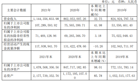 挖贝网4月20日,凯因科技(688687)近日发布2021年度报告,报告期内公司实现营业收入1,144,356,833.98元,同比增长32.75%;归属于上市公司股东的净利润107,289,593.92元,同比增长41.98%。