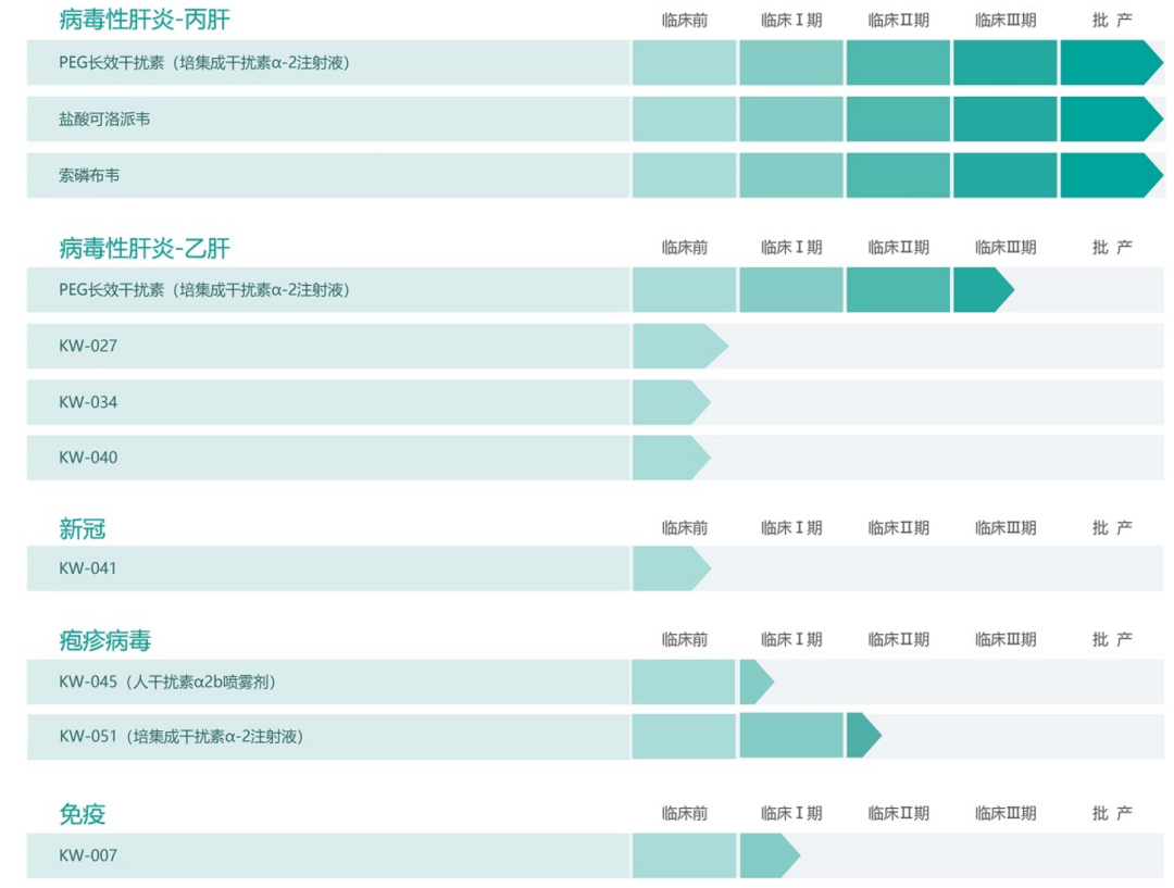 KW-027注射液也是凯因科技第2款进入临床阶段的乙肝新药。凯因科技官网显示,该公司共有4款乙肝新药在研。其中,进展最快的PEG长效干扰素(培集成干扰素α-2注射液)治疗低复制期慢性HBV感染已进入Ⅲ期临床阶段,全部受试者已完成入组。此外,KW-034(重组蛋白)和KW-040(siRNA)目前正在临床前阶段。