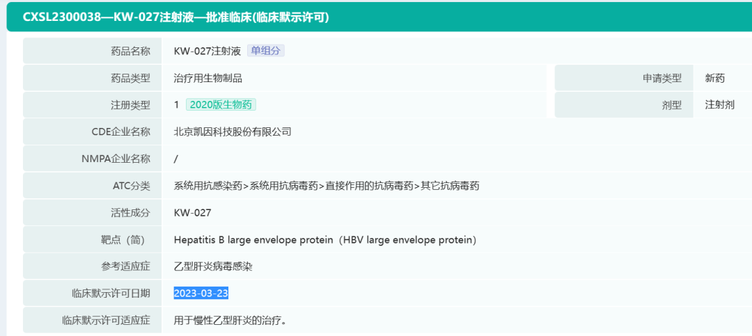 KW-027是凯因科技具有自主知识产权的一款HBsAg单克隆抗体,可以特异性结合并清除乙肝表面抗原(HBsAg),实现血清HBsAg水平的大幅降低。据药融云数据库显示,2023年1月13日,凯因科技递交的KW-027注射液新药临床试验申请被药审中心承办,到此次获批,全程共用时69天。