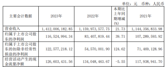 凯因科技昨日晚间发布2023年年度报告。2023年,凯因科技营业收入为14.12亿元,同比增长21.73%;归属于上市公司股东的净利润为1.17亿元,同比增长39.71%;归属于上市公司股东的扣除非经常性损益的净利润为1.23亿元,同比增长124.62%;经营活动产生的现金流量净额为1.27亿元,同比下降5.55%。