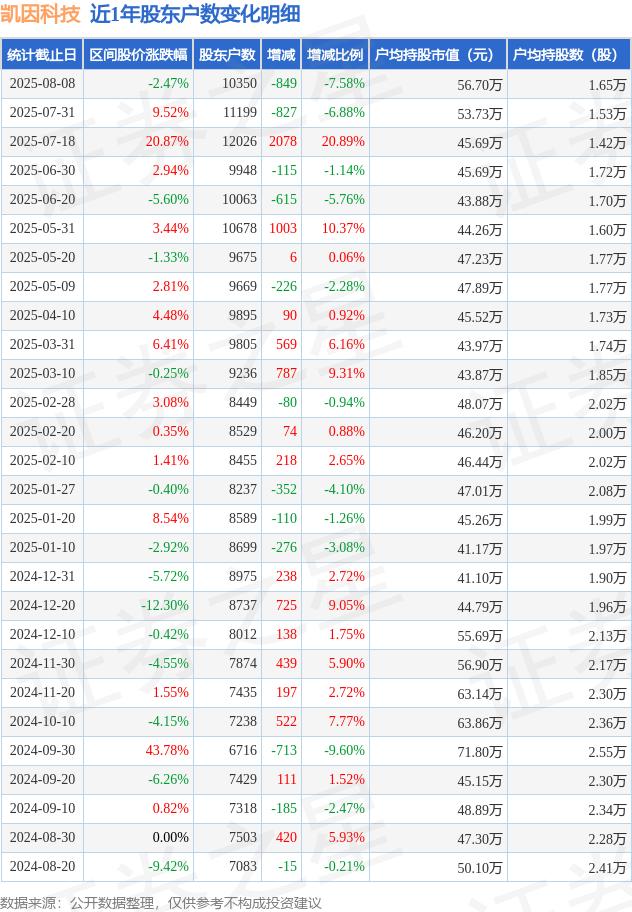 近日凯因科技披露,截至2025年8月8日公司股东户数为1.03万户,较7月31日减少849.0户,减幅为7.58%。户均持股数量由上期的1.53万股增加至1.65万股,户均持股市值为56.7万元。