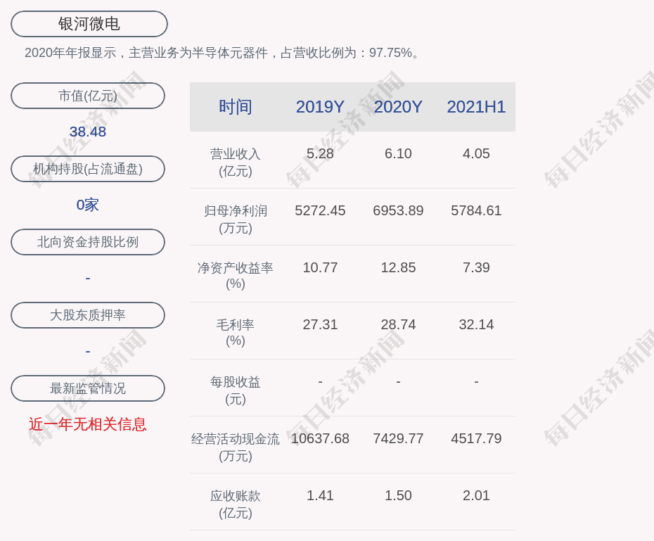 2020年年报显示,银河微电的主营业务为半导体元器件,占营收比例为:97.75%。