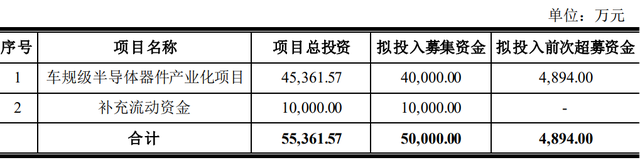 银河微电同日公告指出,除了使用可转债募集资金投向车规级项目外,公司拟使用超募资金4894.00万元,用于采购“车规级半导体器件产业化项目”所需的部分光刻机、减薄机、划片机、装片机等设备。即车规级半导体器件产业化项目的投资资金主要由可转债募集资金及前次超募资金构成,不足部分再由公司自筹。