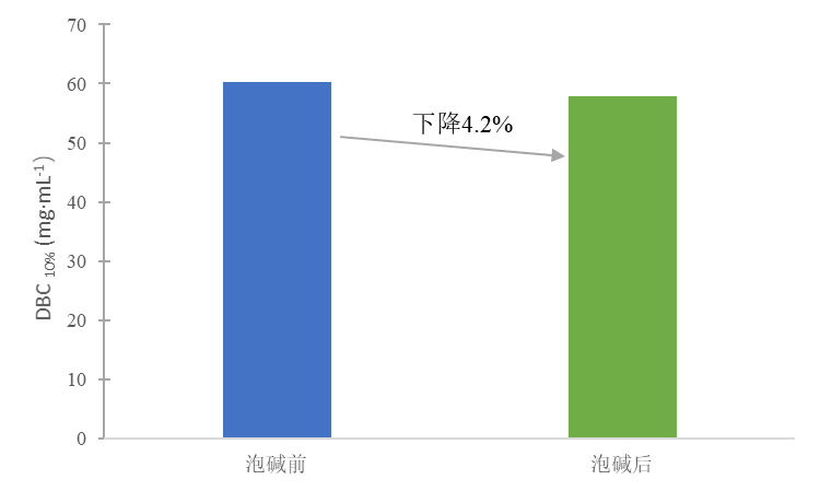 UniMab? EXE拥有纳微科技自主知识产权生产的耐碱型rProtein A 配基,耐受碱清洗,不容易失活或脱落。25℃下0.5 M NaOH 浸泡24小时结果显示, UniMab? EXE 载量仅下降4.2%。优异的耐碱性,将大幅提高UniMab? EXE在抗体生产中的使用寿命,降低生产成本。