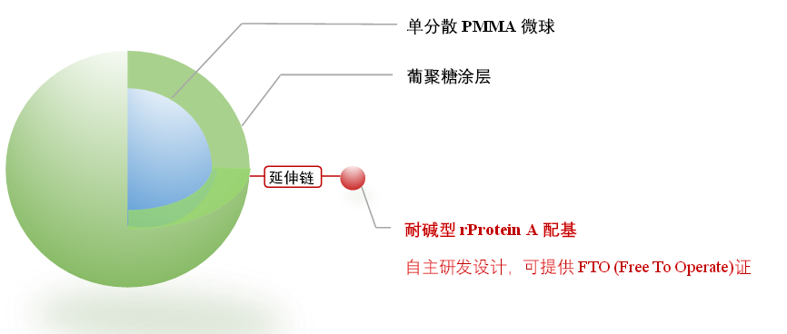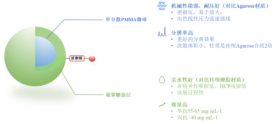 为更好地发挥软硬胶各自的优势,UniMab? EXE采用“刚柔并济”式的设计理念,以刚性单分散多孔PMMA微球为内核,保证介质拥有更好的机械性能,更耐压,支持更高更稳定的柱床;在PMMA微球表面及内部孔洞涂覆柔性葡聚糖涂层,葡聚糖的多羟基结构保证UniMab? EXE拥有出色的亲水性,降低非特异性吸附,同时多羟基意味着更多的Protein A结合位点,可实现更高载量,提升抗体批处理量。
