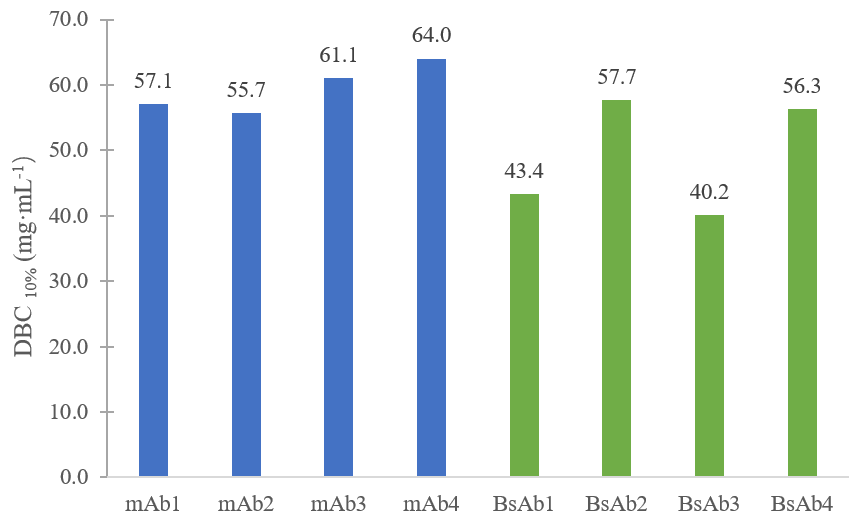 UniMab? EXE葡聚糖涂层提供更多Protein A结合位点,针对不同双抗结合载量显著提升(>40 mg·ml-1),更少的填料就能保证相同的产出,降低生产成本,提高生产效率;另外全新亲水化技术使UniMab? EXE可有效减少非特异性结合,保证产品品质。
