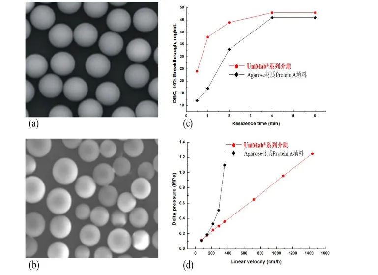 图4.单分散UniMab? EXE电镜图(a),多分散Agarose材质Protein A填料电镜图(b),UniMab?系列与Agarose材质Protein A保留时间—动态载量对比曲线(c),UniMab?系列与Agarose材质Protein A线性流速—压力对比曲线,柱子:16 mm × 400 mm,柱高:23.5 cm(d)
