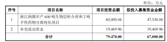 昨日晚间,纳微科技发布的《向不特定对象发行可转换公司债券预案》显示,本次发行的可转换公司债券所募集资金总额不超过人民币67000.00万元(含本数),扣除发行费用后的募集资金净额将用于以下项目:浙江纳微年产600吨生物层析介质和2吨手性药物分离纯化项目、补充流动资金。