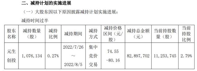 减持前元生创投合计持有公司股份14,279,879股,占公司普通股总股本3.57%,本次减持后持有股份11,253,745股,占公司普通股总股本比例为2.79%。