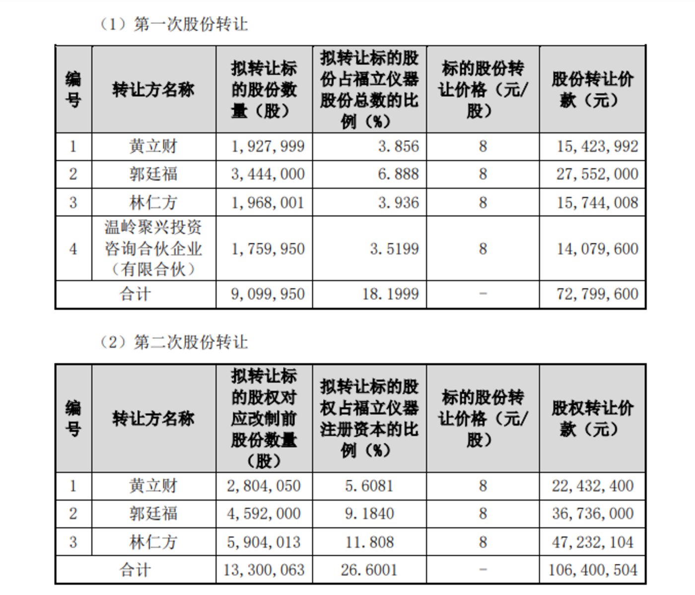 上述两次股权转让完成后,黄立财、郭廷福将分别持有福立仪器14.76%、11.48%股份。而林仁方套现6297.61万元“清仓”。