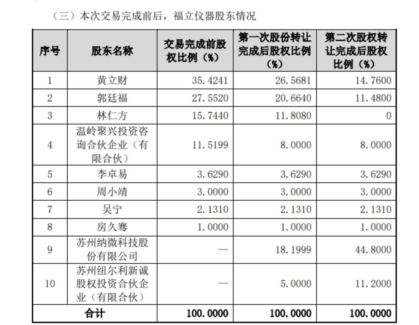 具体而言,第一次股份转让是纳微科技受让福立仪器18.1999%股权,第二次股份转让是福立仪器完成从股转系统摘牌并改制为有限责任公司后,公司受让福立仪器26.6001%股权。