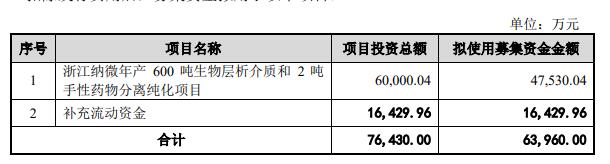 2023年5月13日,纳微科技发布向不特定对象发行可转换公司债券募集说明书(申报稿)(2022年年度财务数据更新版)。本次拟发行可转债募集资金总额不超过人民币63,960.00万元,分别用于浙江纳微年产600吨生物层析介质和2吨手性药物分离纯化项目、补充流动资金。