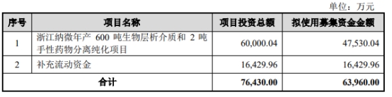 纳微科技2023年9月11日披露向不特定对象发行可转换公司债券募集说明书(申报稿)(2023年半年度财务数据更新版)。公司拟向不特定对象发行可转换公司债券募集资金总额不超过63,960.00万元(含本数),扣除发行费用后,募集资金拟用于浙江纳微年产600吨生物层析介质和2吨手性药物分离纯化项目、补充流动资金。