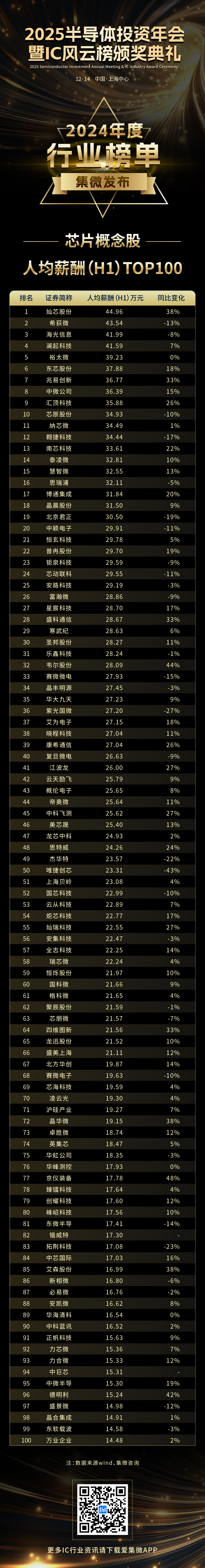 此为“芯片概念股”系列榜单之《中国芯·芯片概念股——人均薪酬(H1)TOP100》。