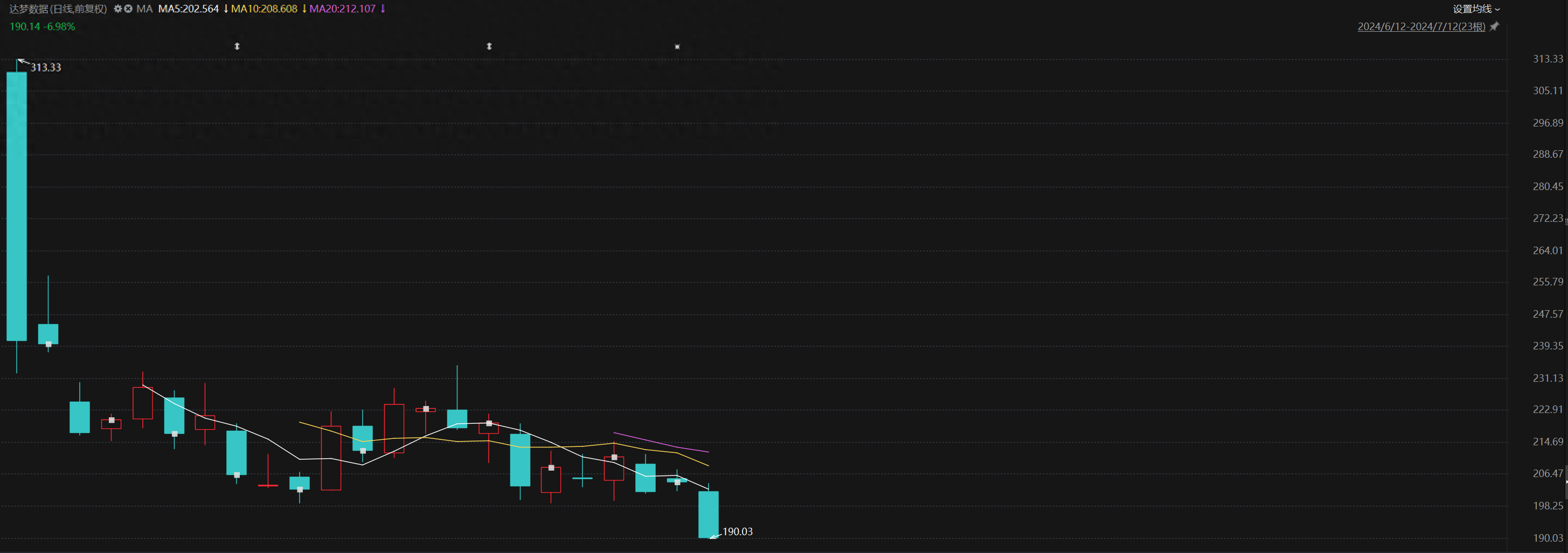 然而,公司上市首日就高开低走,6月12日当天换手率达76.53%,报收240.8元/股。在此之后,达梦数据股价持续震荡下挫,在上市后的一个月内较高点下跌39.32%。