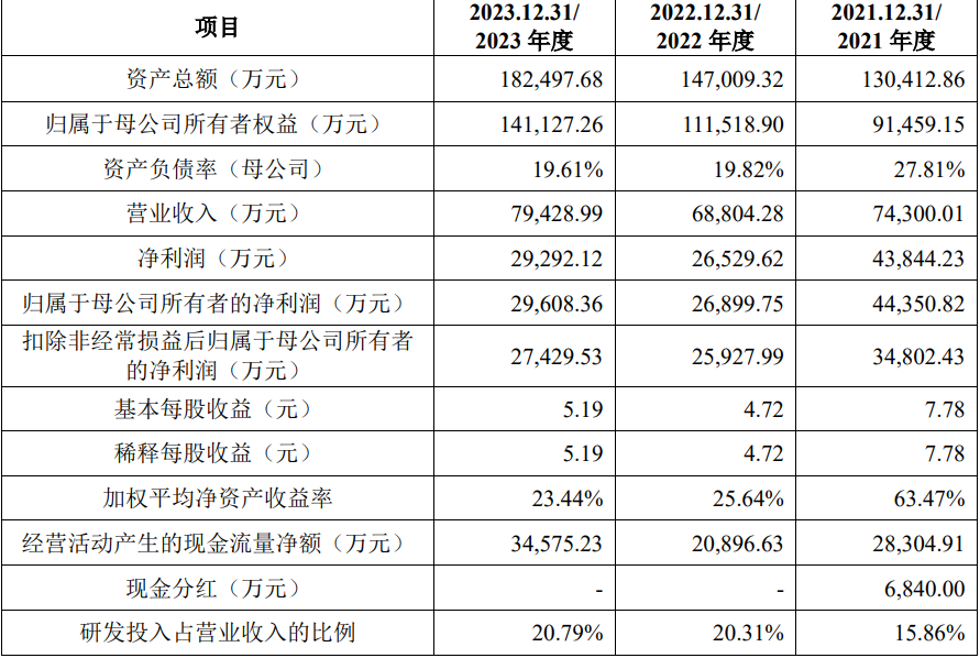 招股书同时显示,公司2021年、2022年及2023年分别实现营业收入7.43亿元、6.88亿元及7.94亿元,分别实现归母净利润4.44亿元、2.69亿元、2.96亿元。公司同时预计了今年上半年的业绩情况,预计上半年实现营业收入3.17亿元至3.4亿元,同比上涨10.27%至18.27%;归母净利润8600万元至1亿元,同比上涨17.25%至36.34%。