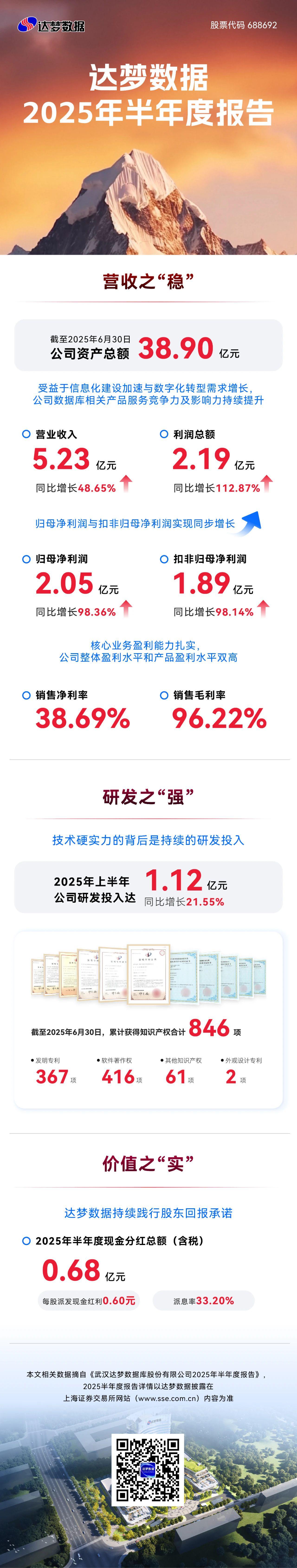 达梦数据2025年半年度报告数据显示:截至2025年6月30日,公司资产总额为38.90亿元;2025年上半年营业收入5.23亿元,同比增长48.65%,2025年上半年利润总额2.19亿元,同比增长112.87%;归母净利润2.05亿元,同比增长98.36%,扣非归母净利润1.89亿元,同比增长98.14%。公司核心财务指标呈增长态势,盈利能力表现突出,释放出强劲的发展动能。