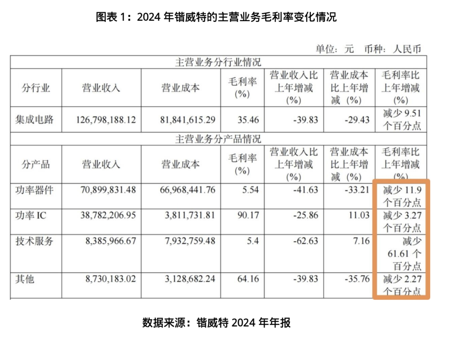 1.行业价格战白热化。近年来,受全球经济增速放缓、下游需求疲软以及晶圆扩产项目集中落地等因素影响,功率半导体行业出现产能过剩的局面,并催生行业价格战。受此影响,2024年,锴威特的主营业务毛利率降至35.46%,同比下降9.51个百分点。