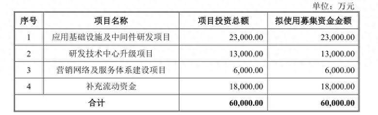 “在大数据、物联网、云计算等新一代信息技术应用不断深化的背景下,广义中间件市场增长迅速,也是公司上市后的重要着力方向。此次登陆科创板,公司募集资金计划重点投资于应用基础设施及中间件研发项目、研发技术中心升级项目、营销网络及服务体系建设项目以及补充流动资金,其中技术研发类项目占比达到约60%。“景新海表示。