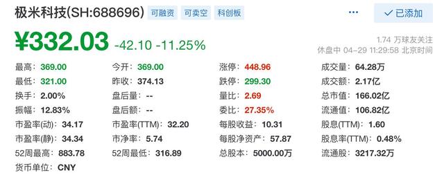 上市后不久,极米科技的股价曾一度冲高至883.78元/股。而截至2022年4月28日,极米科技则收报374.13元/股,相对跌幅达到57.67%。截至2022年4月29日午盘,极米科技暂报332.03元/股,较上一个交易日下跌11.25%,总市值降至166.02亿元。