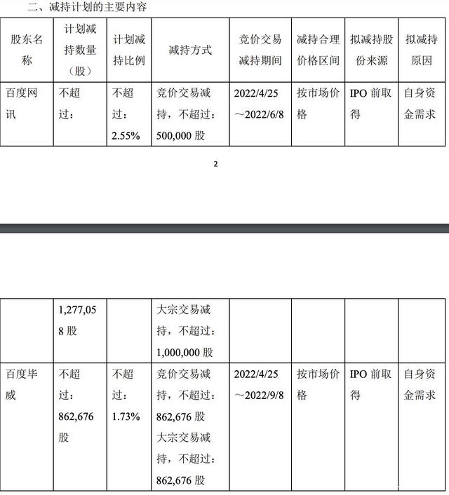 其中,百度网讯拟通过竞价交易、大宗交易方式减持股份数量不超过127.7万股股份,占总股本的2.55%;百度毕威拟通过竞价交易、大宗交易方式减持股份数量不超过86.27万股股份,占总股本的1.73%,减持原因均为自身资金需求。