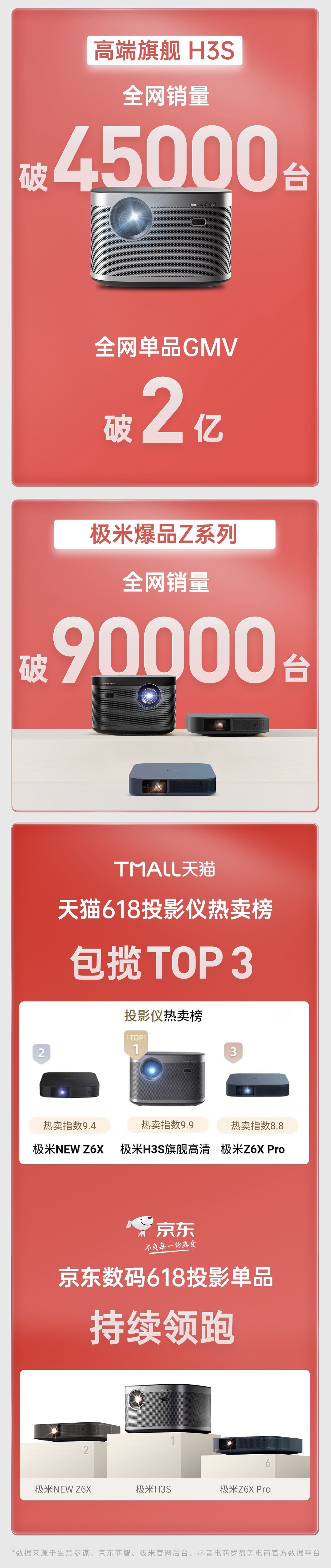 从单品上看,高端旗舰H3S全网销量破45000台,全网单品GMV破2亿,极米爆品Z系列全网销量破90000台。其中,极米H3S、极米NEW Z6X、极米Z6X Pro成功包揽天猫618投影仪热卖榜前三,并且持续领跑京东数码618投影单品。