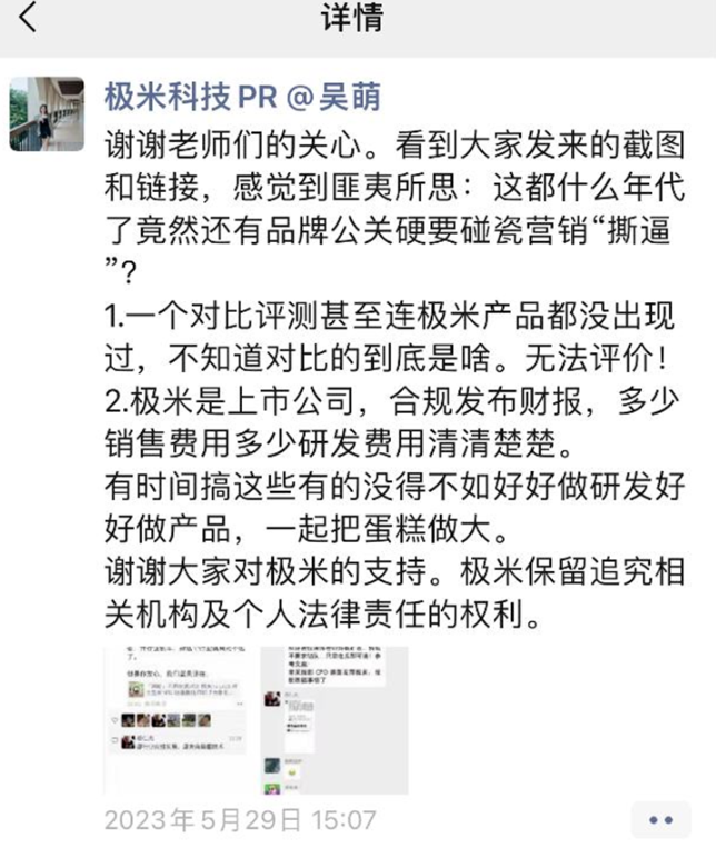 事情发酵后,极米科技公关在朋友圈“隔空回应”,表示“这都什么年代了竟然还有品牌公关硬要碰瓷营销‘撕逼’。”同时表示极米保留追究相关机构及个人法律责任的权利。