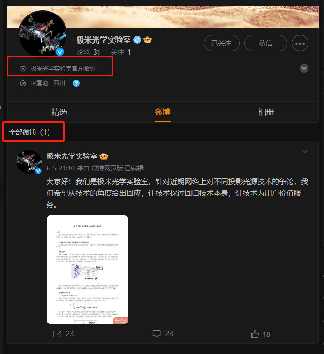 值得注意的是,极米光学实验室在微博上的粉丝数量仅有31人,其只关注了极米科技官方微博。其发表的唯一一条微博就是批评三色激光技术的文章。同时,极米科技6月9日的线下体验活动似乎遭遇了波折,一些社交媒体大V表示他们在试图与极米科技取得联系时并未得到回复。